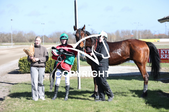 - Beskrivelse: JERRY med Camilla Boeck Munk vinder dagens 7 løb. Monteløb - Amerikanerløb. Spar Nord Arena-Aalborg Væddeløbsbane d.6/4-2026. Fotograf: Hesselborg Foto