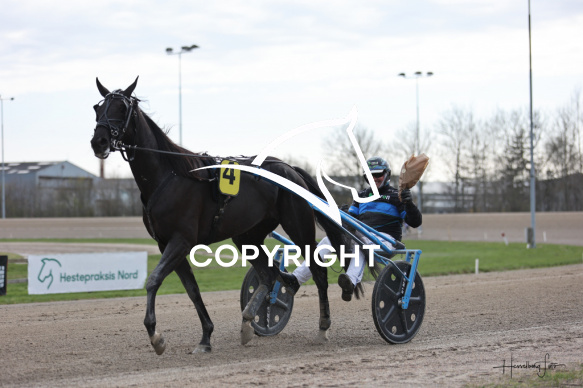 - Beskrivelse: Vinderen af 1 løb blev LÆRKE D med Morten Friis. Amerikanerløb m. justering af startspor Spar Nord Arena-Aalborg Væddeløbsbane d.16/4-2026. Fotograf: Hesselborg Foto