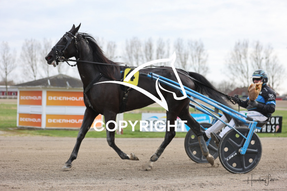 - Beskrivelse: Vinderen af 1 løb blev LÆRKE D med Morten Friis. Amerikanerløb m. justering af startspor Spar Nord Arena-Aalborg Væddeløbsbane d.16/4-2026. Fotograf: Hesselborg Foto
