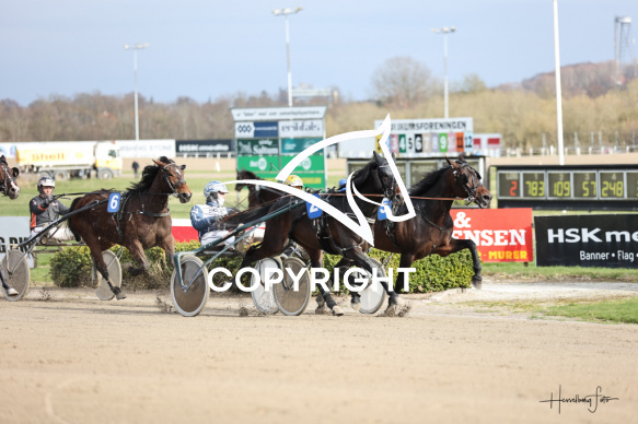 - Beskrivelse: Løb 2 blev vundet af MASTER CHIEF med Casper M. Nielsen. Amerikanerløb m. justering af startspor. Spar Nord Arena-Aalborg Væddeløbsbane d.16/4-2026. Fotograf: Hesselborg Foto