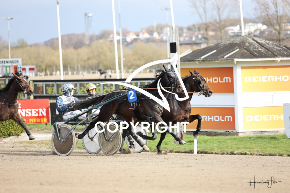 - Beskrivelse: Løb 2 blev vundet af MASTER CHIEF med Casper M. Nielsen. Amerikanerløb m. justering af startspor. Spar Nord Arena-Aalborg Væddeløbsbane d.16/4-2026. Fotograf: Hesselborg Foto