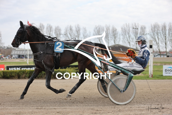 - Beskrivelse: Løb 2 blev vundet af MASTER CHIEF med Casper M. Nielsen. Amerikanerløb m. justering af startspor. Spar Nord Arena-Aalborg Væddeløbsbane d.16/4-2026. Fotograf: Hesselborg Foto