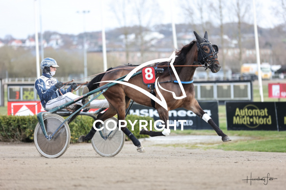 - Beskrivelse: PRECIOUS BOY A J med Birger Jørgensen vandt dagens 3 løb. Amerikanerløb m. justering af startspor Spar Nord Arena-Aalborg Væddeløbsbane d.16/4-2026. Fotograf: Hesselborg Foto