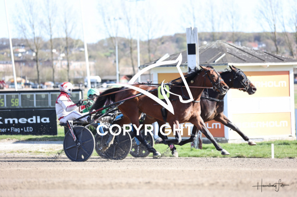 - Beskrivelse: Fordel hopper og 3-åringer Vinderen af 1 løb blev KOMSÅLANGBORG med Knud Mønster. Fordel hopper og 3-åringer. Spar Nord Arena-Aalborg Væddeløbsbane d.23/4-2026. Fotograf: Hesselborg Foto